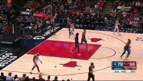 比赛进行到第二节,森林狼队和公牛队的比分依然紧咬。此时,森林狼队的年轻球员科温顿站了出来。他利用出色的速度和敏捷性,在公牛队的防守中完成了一次精彩的突破上篮,为森林狼队再次扩大了领先优势。